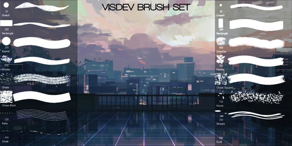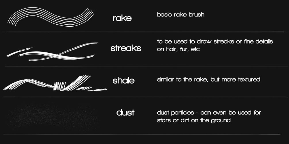 It consists of a few fundamental brushes which I always use such as 'the rectangle' but also a bunch of really stylized ones to help me paint different forms and materials easily.